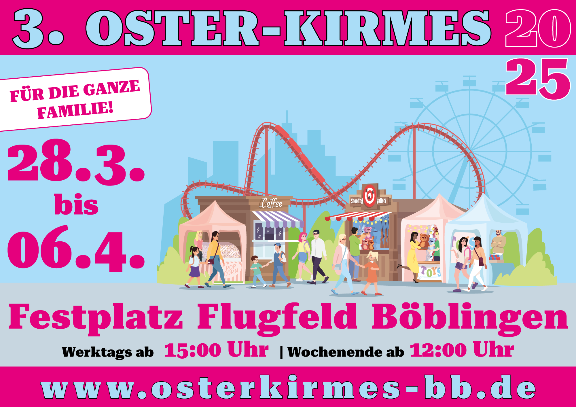 Die Oster-Kirmes auf dem Festplatz Flugfeld in Böblingen kehrt zurück! Nach der Prämiere im letzten Jahr startet die Kirmes am Freitag, den 28. März, in die nächste Runde und lädt bis zum 06. April zu einem unvergesslichen Erlebnis ein.